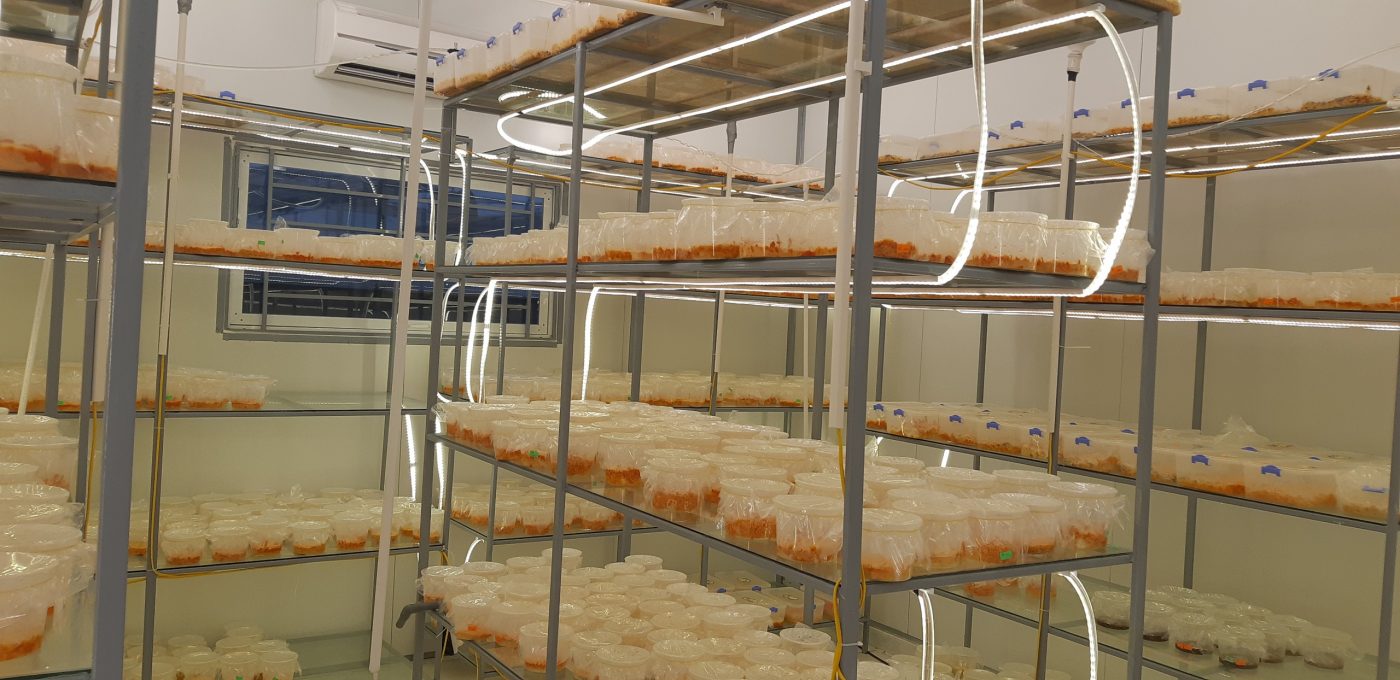- Giai đoạn cảm ứng tạo quả thể (cơ quan sinh sản) trong pha sáng: Giai đoạn được áp dụng công nghệ cảm ứng bằng đèn LED với tỷ lệ phối trộn giữa ánh sáng và bước sóng thích hợp khác nhau để kính thích quá trẻ phát triển quả thể. Đồng thời ức chế sự phát triển của nấm tạp, rút ngắn thời gian sinh trưởng của quả thể và có thể thu hoạch sau từ 35 – 40 ngày.