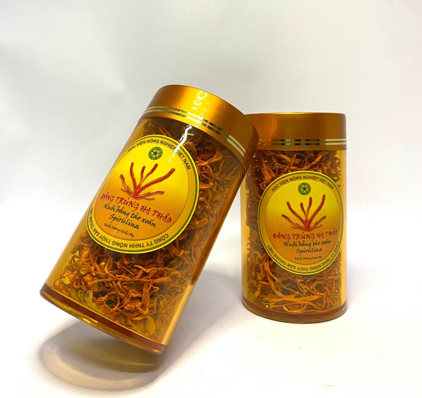 Tại VNUA Pharma, Đông trùng hạ thảo được nuôi trồng bằng tảo xoắn Spirulina. Đơn vị đã tiến hành thay thế toàn bộ pepton cũng như là bột nhộng tằm (tức là nguồn protein động vật) bằng nguồn protein có trong tảo xoắn. Chính vì thế, VNUA Pharma đã cho ra mắt một sản phẩm hoàn toàn hữu cơ sở hữu đồng thời hai hoạt chất: adenosine và cordycepin. Đây là hai loại hoạt chất giúp ngăn ngừa ung thư hiệu quả gấp 3 lần so với quy trình thông thường.