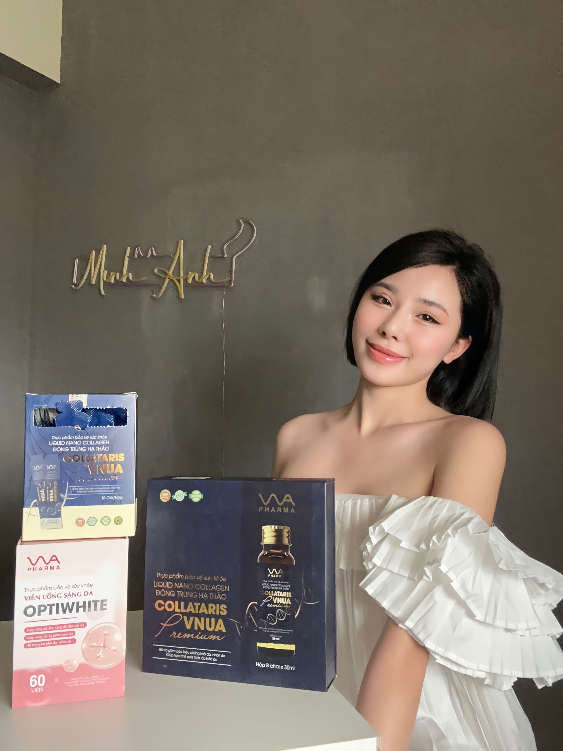 Trong mắt mọi người, Minh Anh luôn là người tràn đầy năng lượng tích cực và làn da trắng sáng, căng mịn luôn nổi bật trước đám đông. Khi được hỏi bí quyết chăm da cô tự tin trả lời rằng:” Em dùng collagen collataris và viên uống sáng da Optiwhite nhà Vnua Pharma, mọi người muốn da căng mịn, trắng hồng không tì vết thì hãy dùng bộ đôi này nhé”