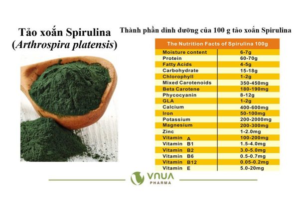 Tảo xoắn Spirulina sở hữu hàm lượng chất dinh dưỡng đáng ngạc nhiên không phải loại thực phẩm nào cũng có. Tảo xoắn Spirulina giàu protein chiếm hơn 60% tất cả các protein thực vật tiêu hóa. Đặc biệt, spirulina có tất cả các axit amin thiết yếu có tỷ lệ hoàn hảo. Trong khi đó, thịt bò chỉ có 22% protein. Nó cũng có nồng độ beta carotene, vitamin B-12, sắt và khoáng chất vi lượng cao nhất và axit béo thiết yếu hiếm hoi GLA – axit béo n-6 cho cơ thể.