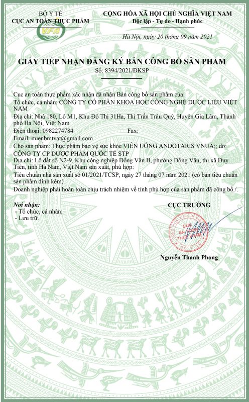 Sản phẩm Kháng virus Andotaris VNUA được Bộ Y Tế – Cục An Toàn Thực Phẩm cấp chứng nhận đăng ký công bố sản phẩm. dưới hình thức là thực phẩm bảo vệ sức khỏe. Kháng virus Andotaris VNUA được ra mắt mong muốn nhanh chóng chung tay cùng cộng đồng đẩy lùi dịch Covid-19 và có thể đưa đến tận tay người tiêu dùng để kịp thời phòng ngừa và điều trị virus Sars-CoV-2 trong giai đoạn dịch bệnh căng thẳng hiện nay.