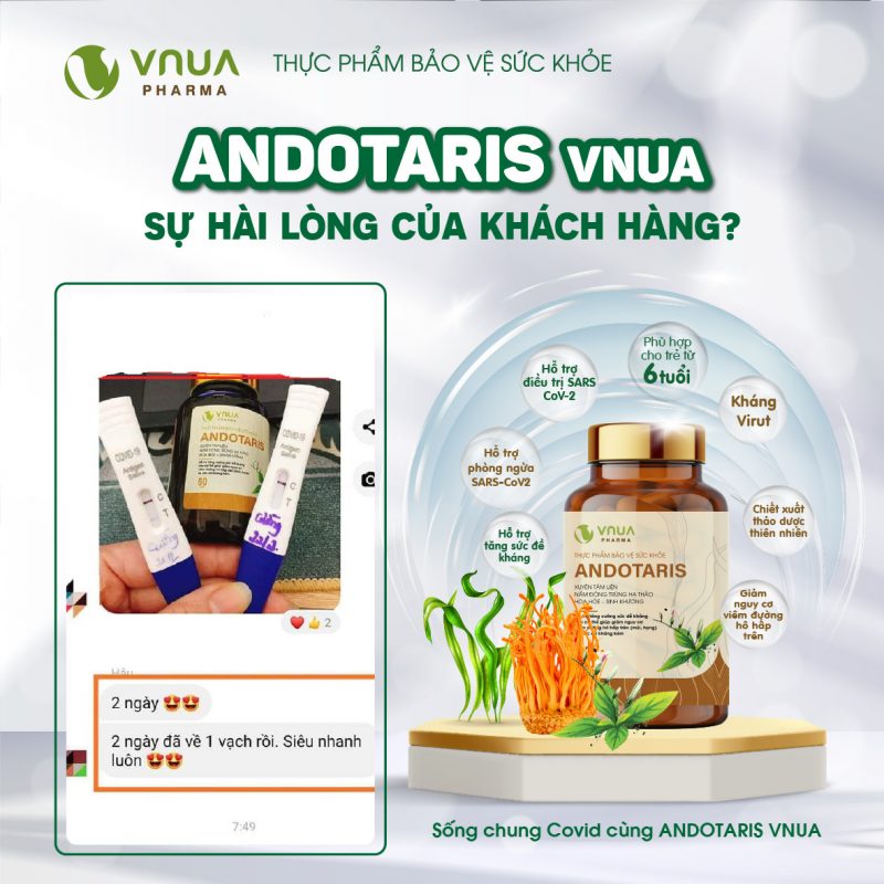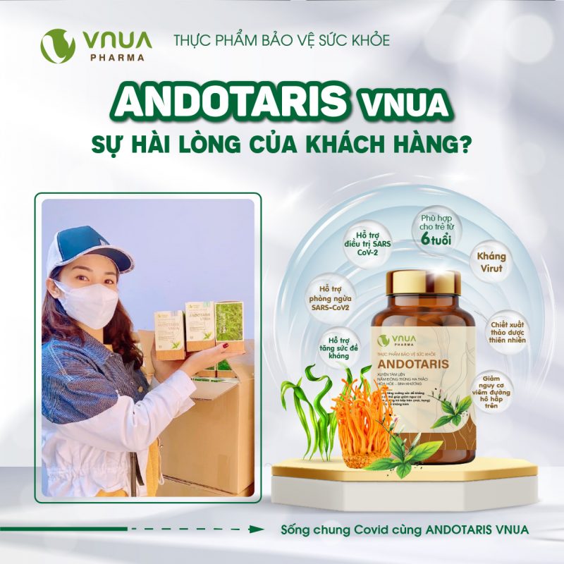 Thực phẩm bảo vệ sức khỏe Andotaris VNUA được kiểm định nghiêm ngặt, đảm bảo an toàn thực phẩm, có hiệu quả sử dụng cao. Chính vì thế, hàng nghìn khách hàng đã tin dùng và phản hồi tốt về Andotaris VNUA, sản phẩm còn được giới thiệu thêm cho người thân bạn bè mua nhiều hộp để sẵn trong nhà để sử dụng dần, nhất là trong thời điểm dịch bệnh căng thẳng nhất hiện nay.